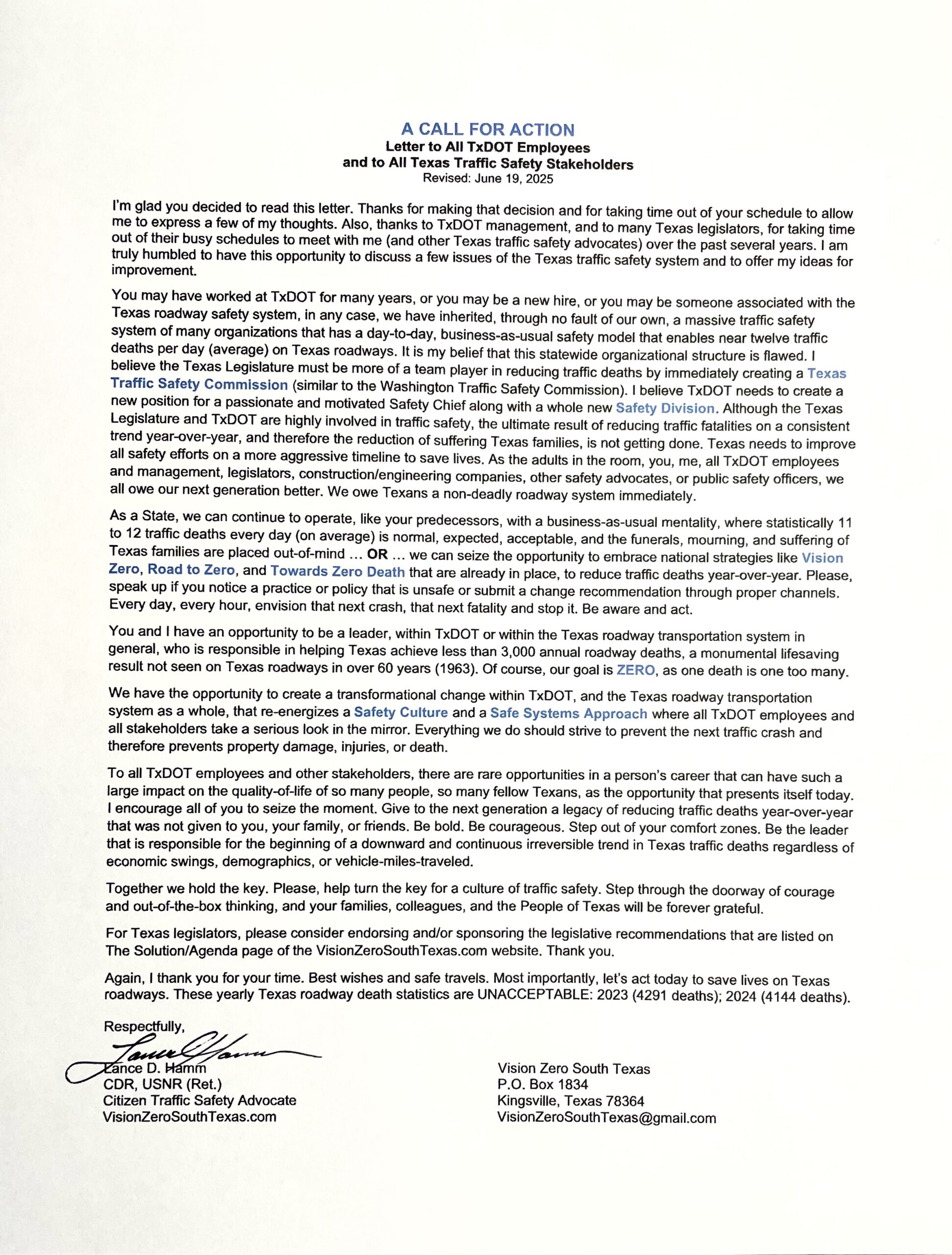 VZSTx Legislative Packet 2025 is a pdf packet of documents that can be used by Texas Legislators, TxDOT officials, or any Texas Traffic Safety Stakeholder to understand the full agenda of Vision Zero South Texas (to be used in conjunction with the data and photos on this Vision Zero South Texas website). Documents in the packet include the one-page informational flyer, the “Call for Action” letter, Recommendations to TxDOT’s External Partners Workgroup for System Safety, and an Addendum document depicting the recommendation for TxDOT to create a new centralized Safety Division and the recommendation for the Texas Legislature to create a new Texas Traffic Safety Commission that would be very similar to the Commission used in Washington State. Each of these documents listed above are provided separately to be downloaded separately, if desired.